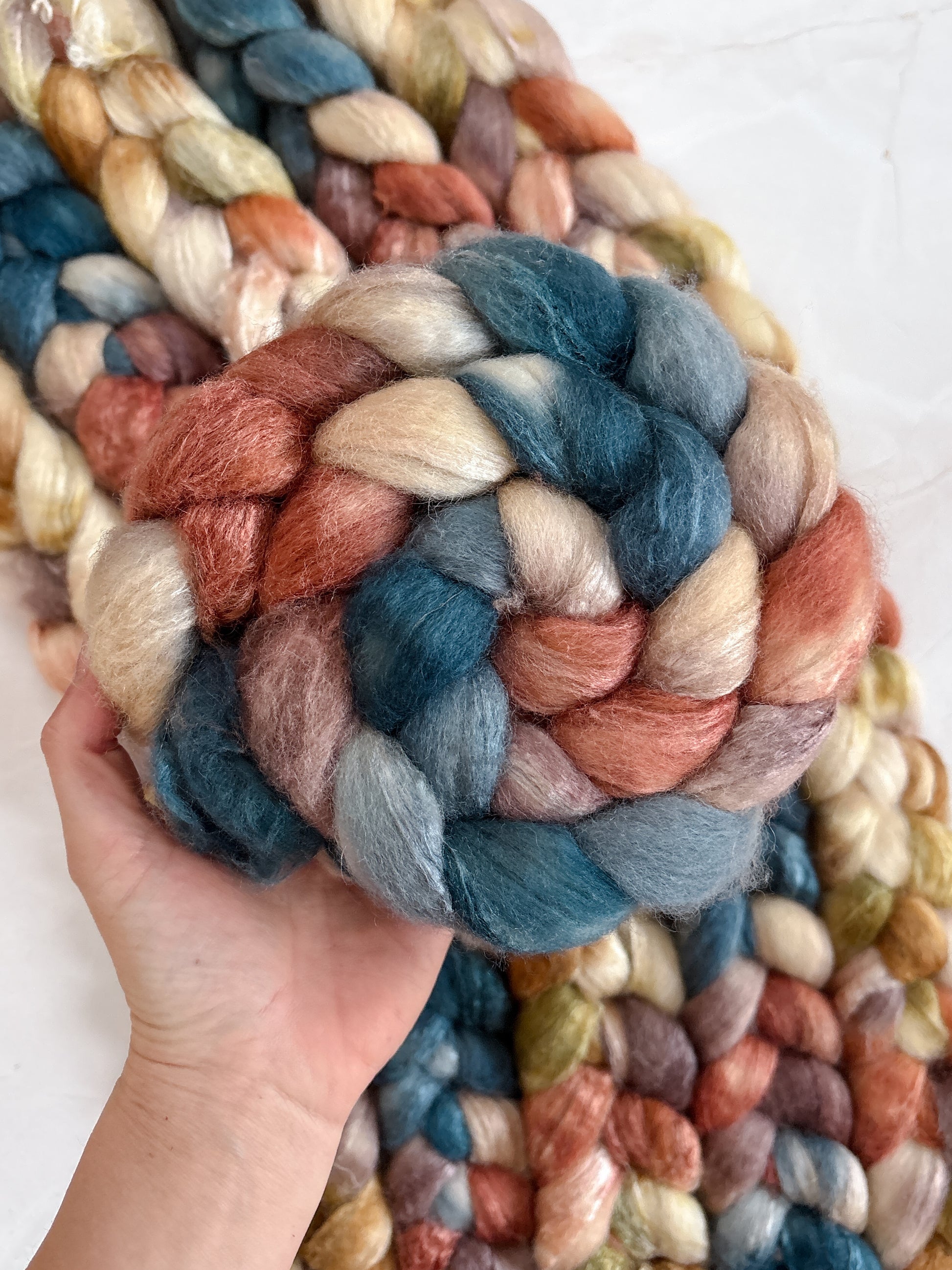 blue faced leicester/silk: 70% non-superwash blue faced leicester, 30% tussah silk; 26 microns