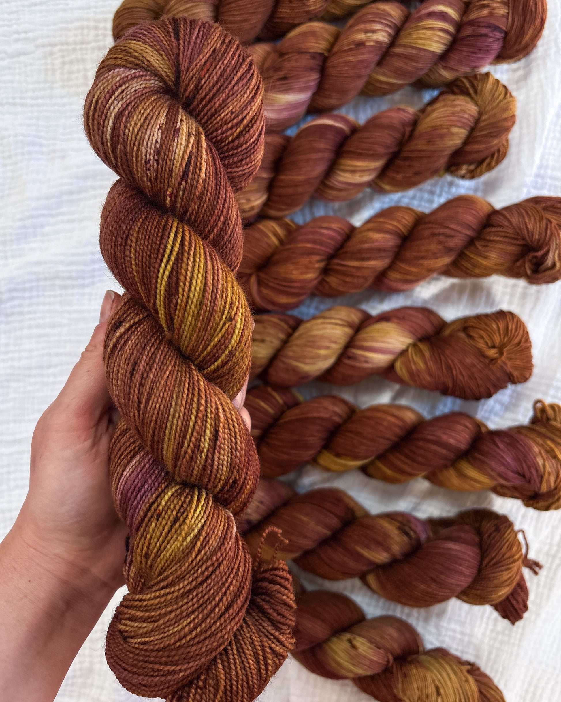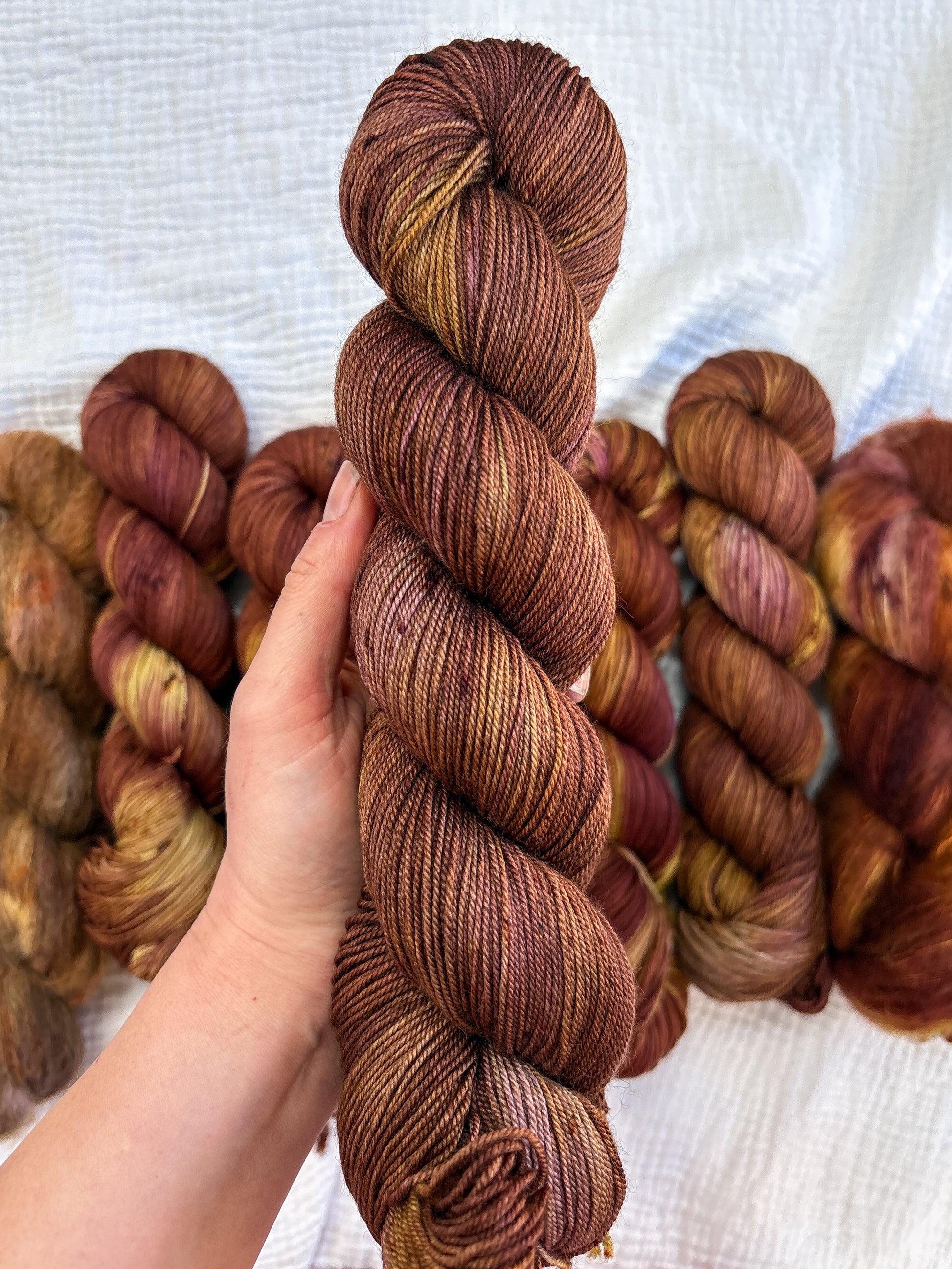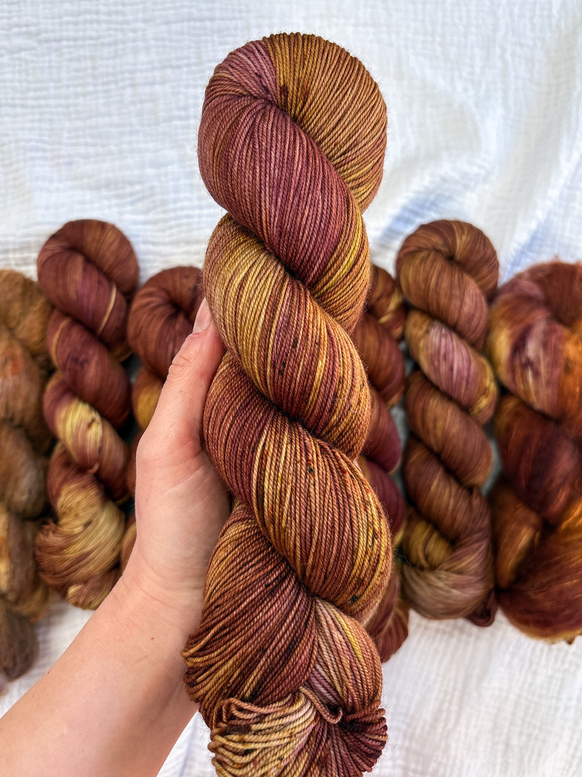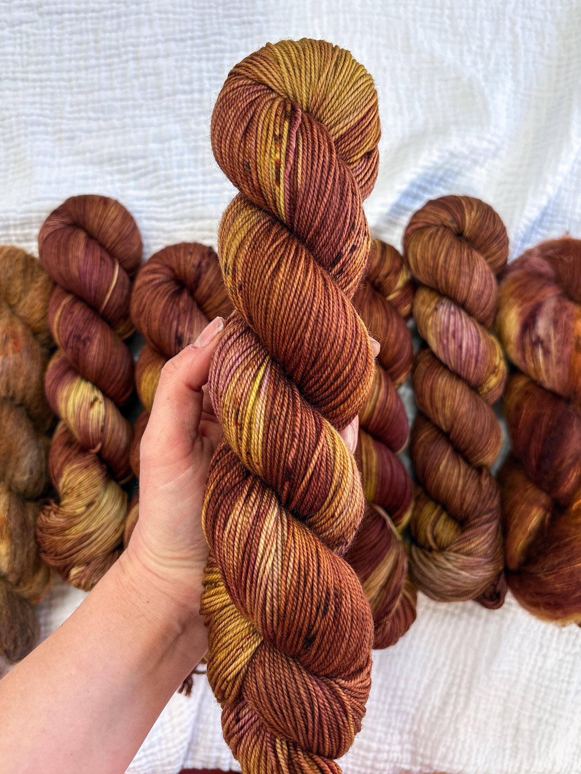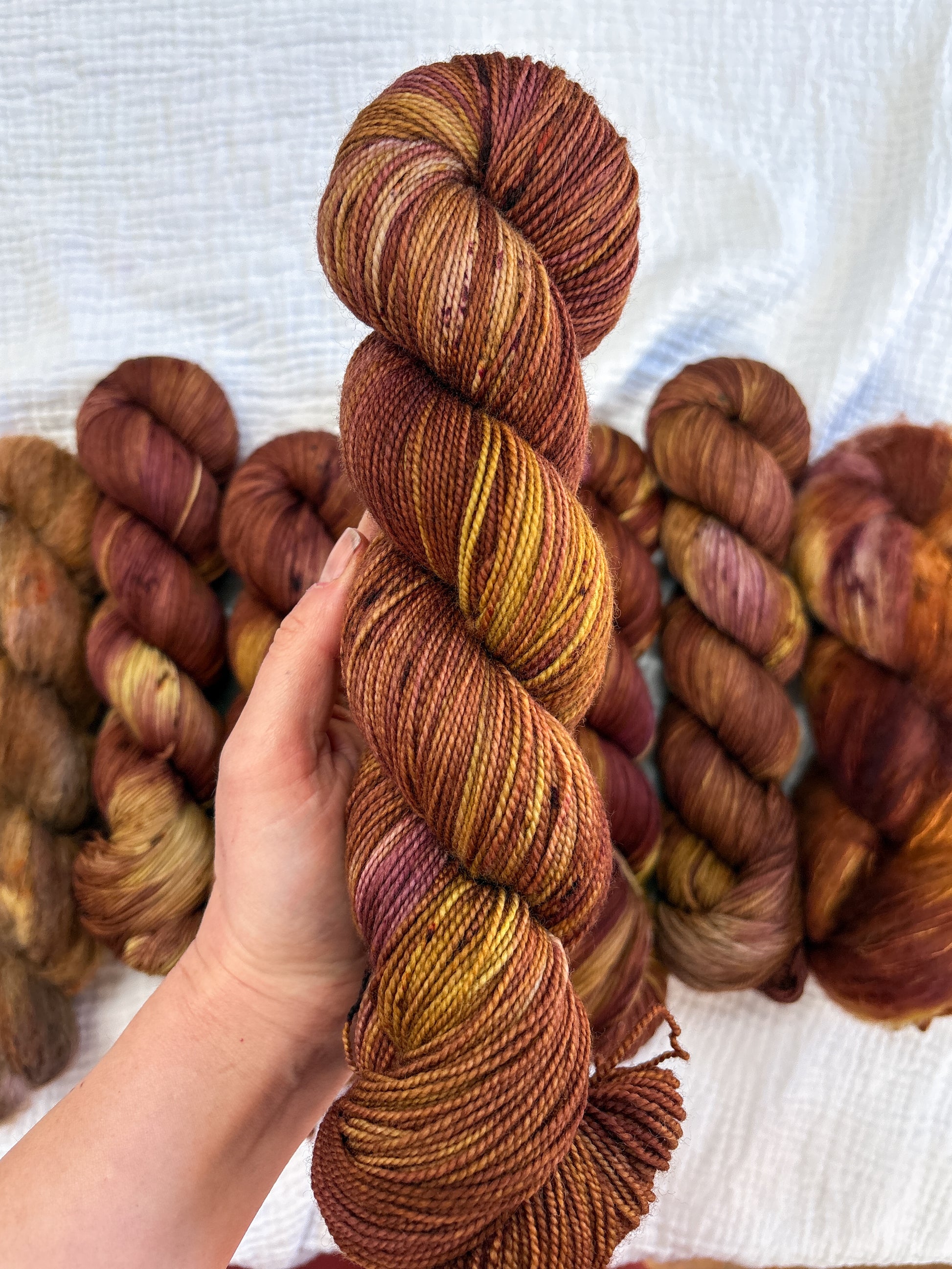 Due to the nature of hand-dyed, speckled yarn and fiber, each skein may differ slightly both within and between skeins. Alternating skeins is highly recommended, especially when working larger projects with multiple skeins of the same colorway.