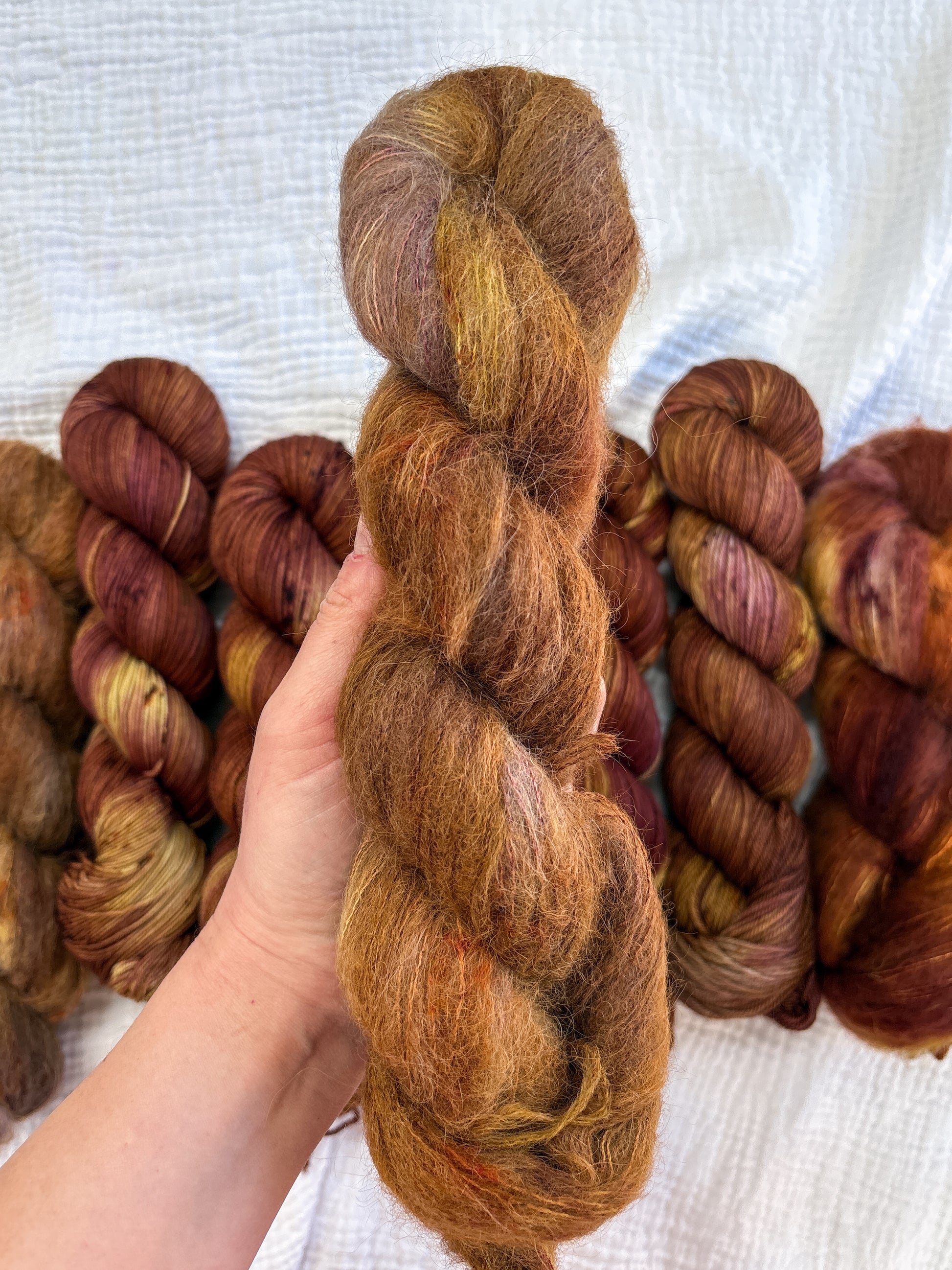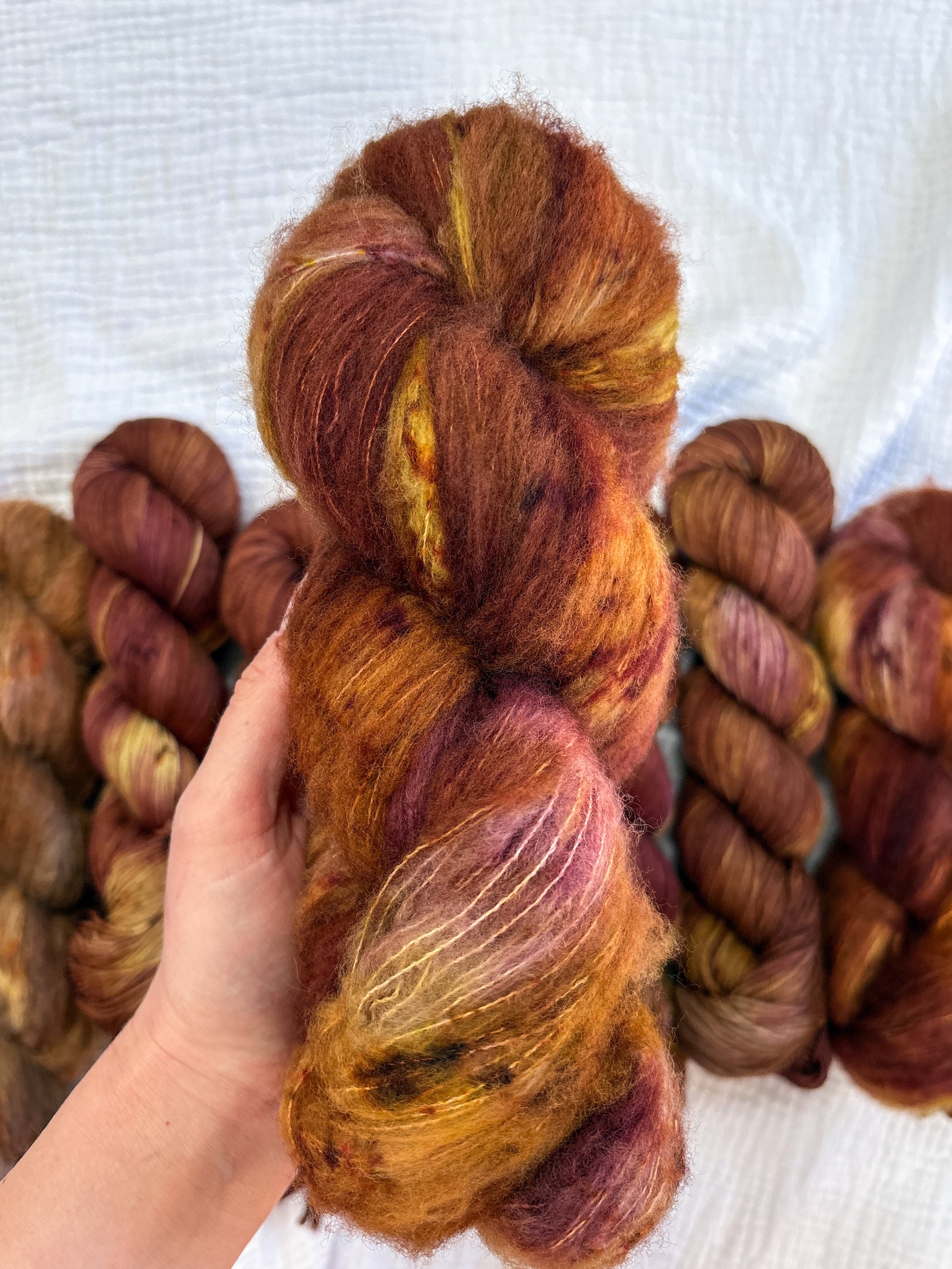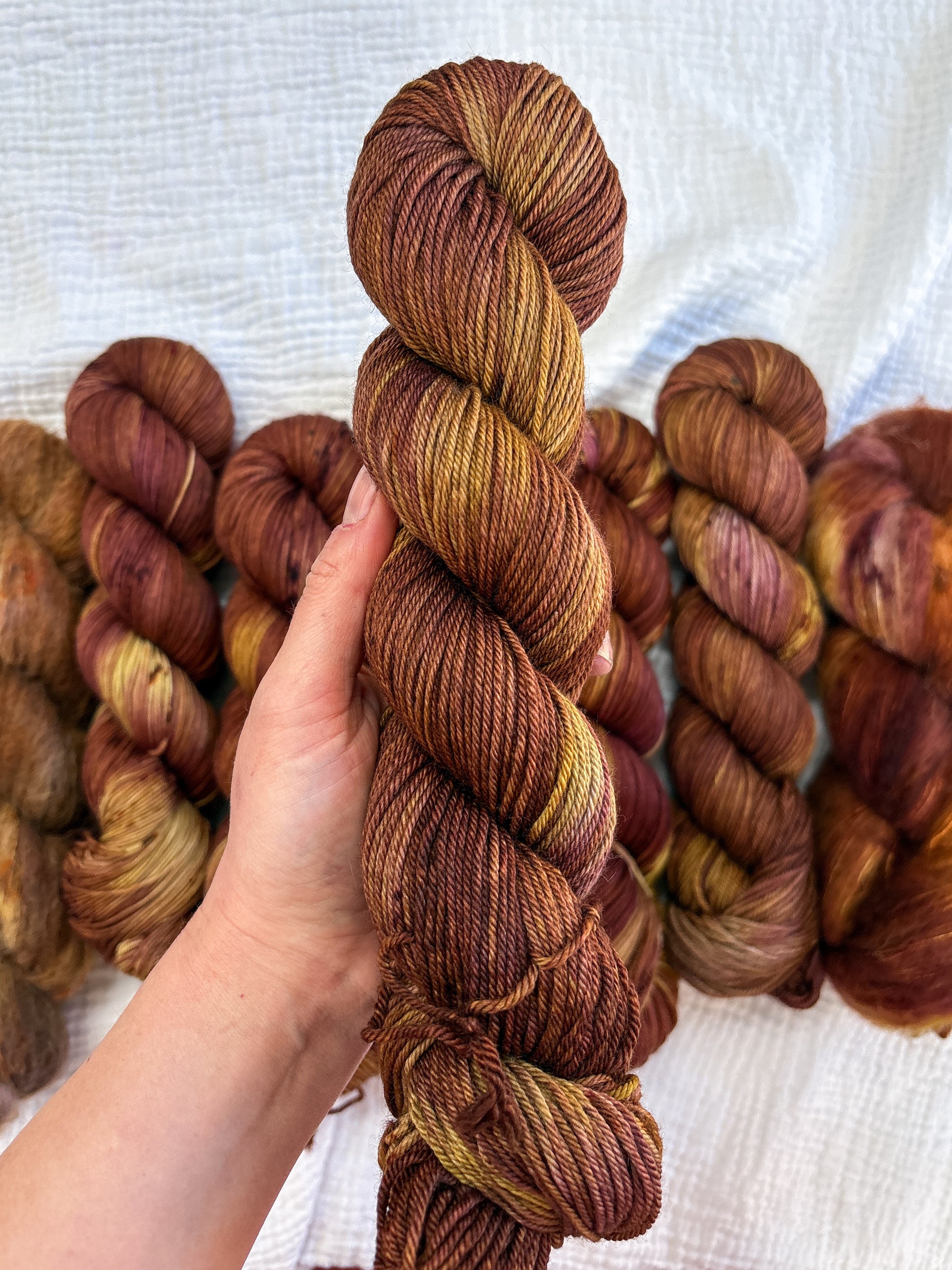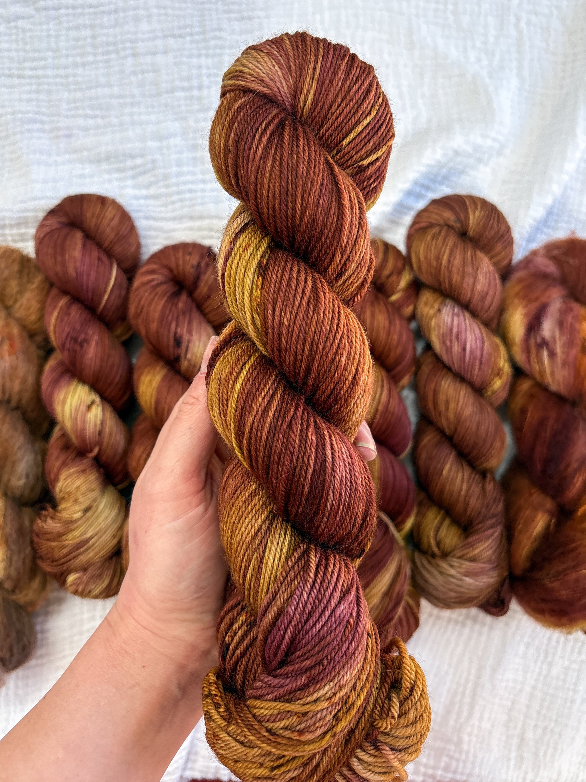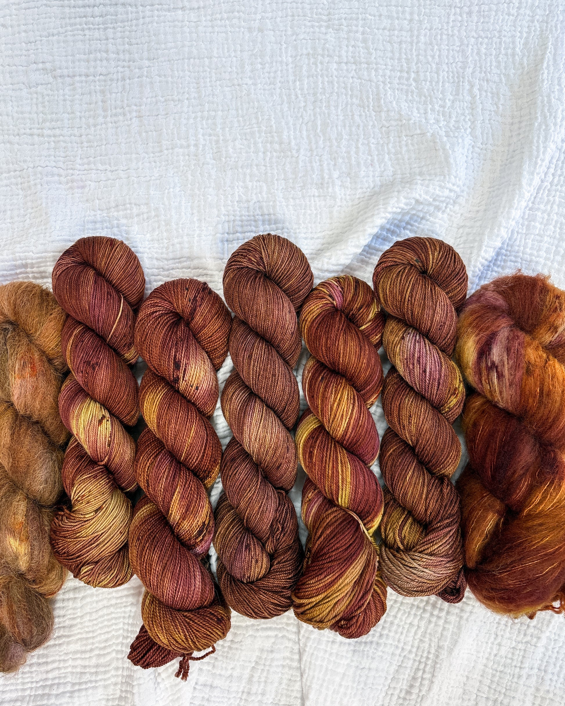 Due to the nature of hand-dyed, speckled yarn and fiber, each skein may differ slightly both within and between skeins. Alternating skeins is highly recommended, especially when working larger projects with multiple skeins of the same colorway.