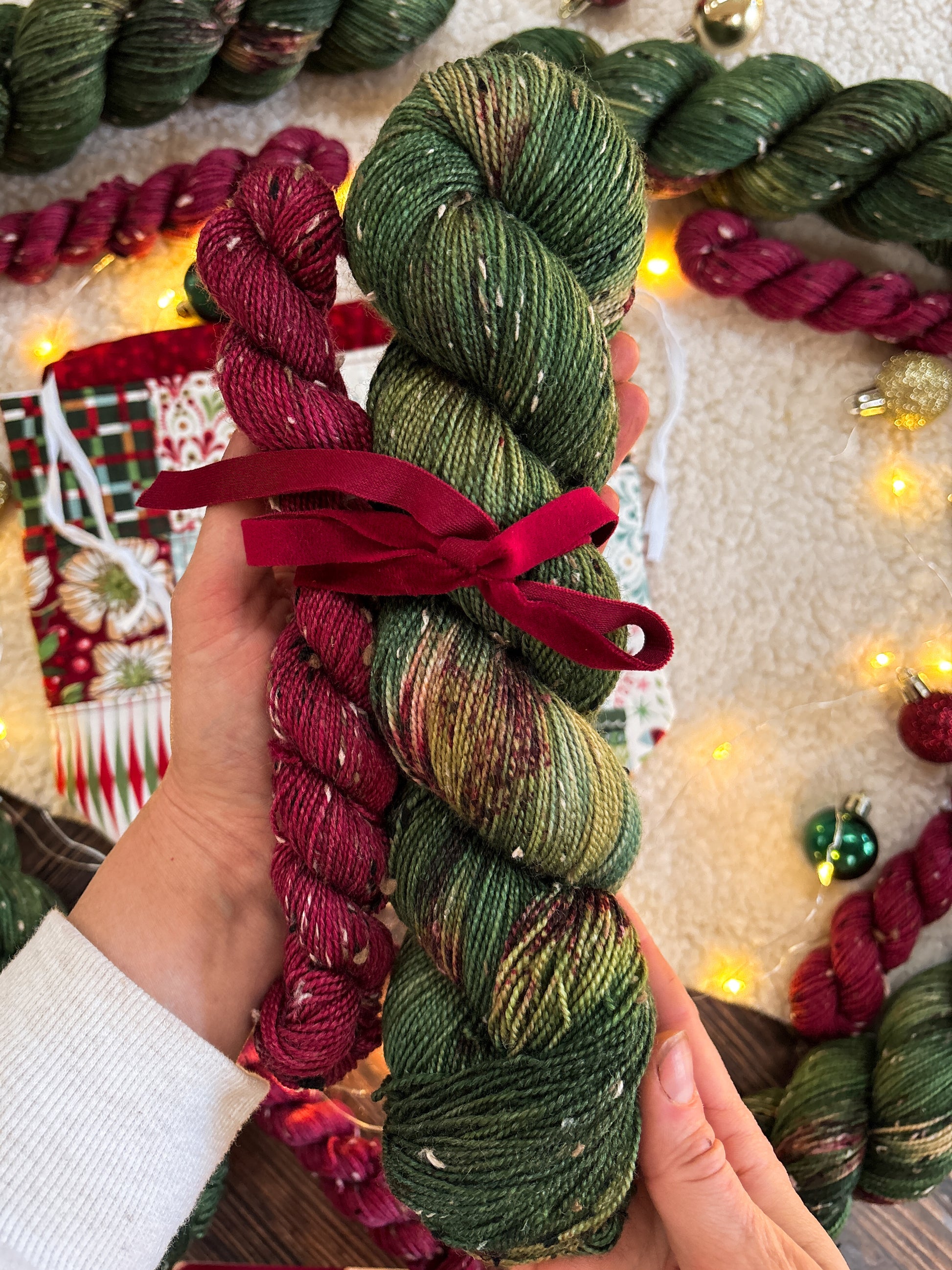 Trim the Tree features a base of swirling pine and forest greens with deep cranberry red, golden copper, and pine green speckles throughout. It is paired with a Winterberry red mini skein.